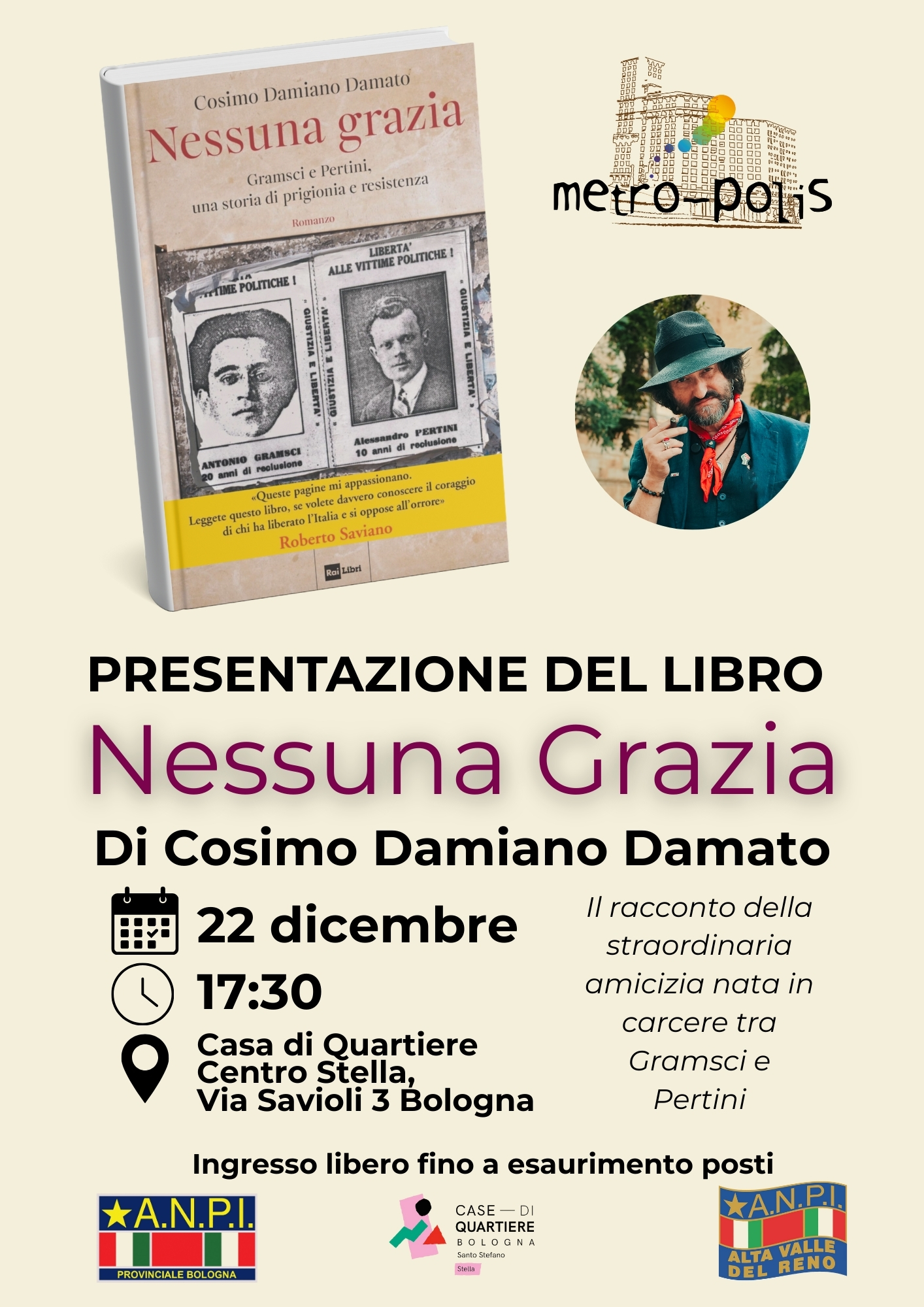 Lunedì 22 dicembre, presso la Casa di Quartiere Centro Stella in Via Savioli 3 alle ore 17,30 presenteremo il libro Nessuna Grazia di Cosimo Damiano Damato.